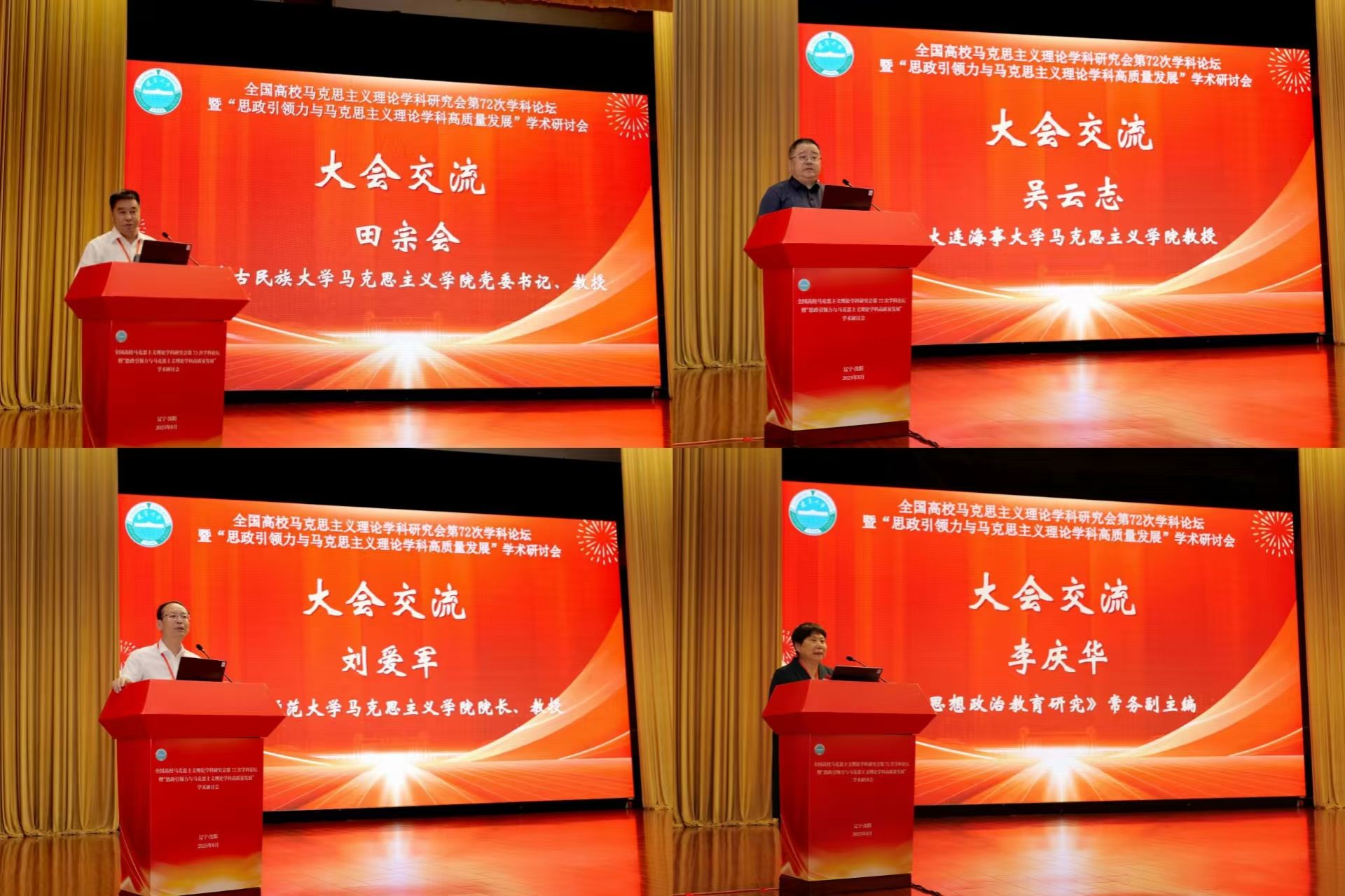 在大会交流环节,内蒙古民族大学马克思主义学院党委书记田宗会教授、大连海事大学马克思主义学院吴云志教授、哈尔滨师范大学马克思主义学院院长刘爱军教授分别就平行论坛三个主题进行交流发言。该环节由《思想政治教育研究》常务副主编李庆华教授主持。