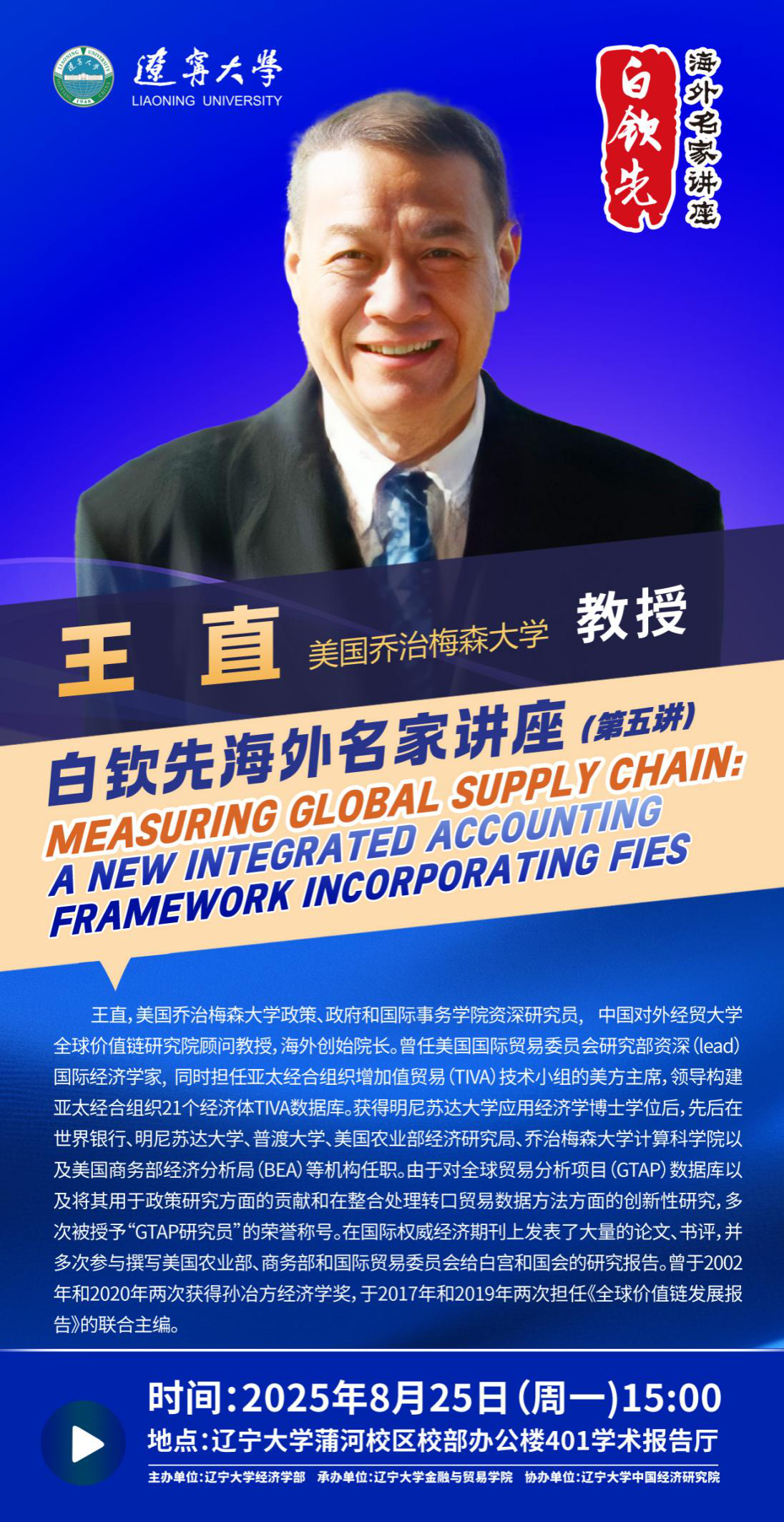 王直,美国乔治梅森大学政策、政府和国际事务学院资深研究员, 中国对外经贸大学全球价值链研究院顾问教授,海外创始院长。曾任美国国际贸易委员会研究部资深(lead)国际经济学家, 同时担任亚太经合组织增加值贸易(TIVA)技术小组的美方主席,领导构建亚太经合组织21个经济体TIVA数据库。获得明尼苏达大学应用经济学博士学位后,先后在世界银行、明尼苏达大学、普渡大学、美国农业部经济研究局、乔治梅森大学计算科学院以及美国商务部经济分析局(BEA)等机构任职。由于对全球贸易分析项目(GTAP)数据库以及将其用于政策研究方面的贡献和在整合处理转口贸易数据方法方面的创新性研究,多次被授予“GTAP研究员”的荣誉称号。在国际权威经济期刊上发表了大量的论文、书评,并多次参与撰写美国农业部、商务部和国际贸易委员会给白宫和国会的研究报告。曾于2002年和2020年两次获得孙冶方经济学奖,于2017年和2019年两次担任《全球价值链发展报告》的联合主编。