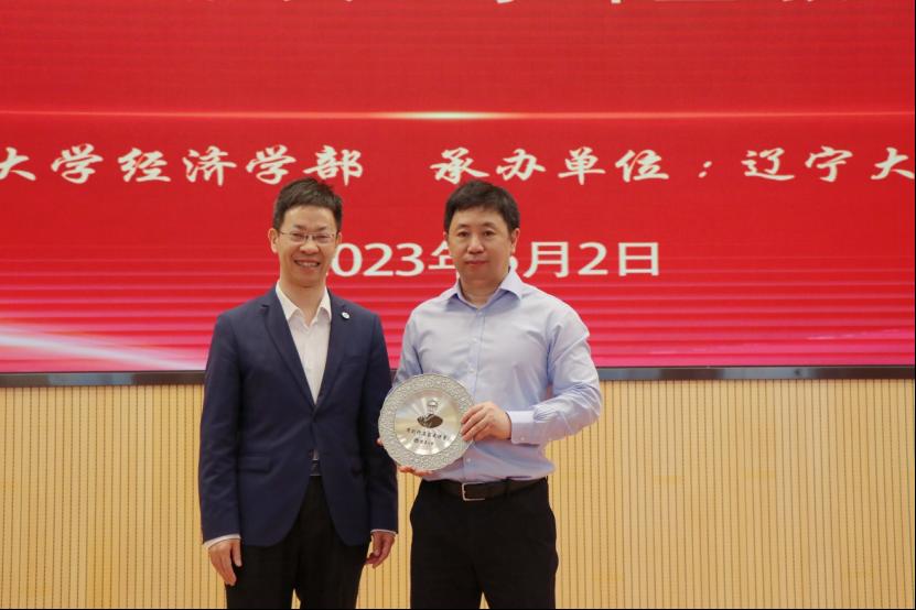 报告会最后,余淼杰为李坤望教授颁发宋则行名家大讲堂纪念盘和纪念证书,经济学部教师代表为李坤望教授佩戴校徽,经济学部学生代表向李坤望教授献花致敬。