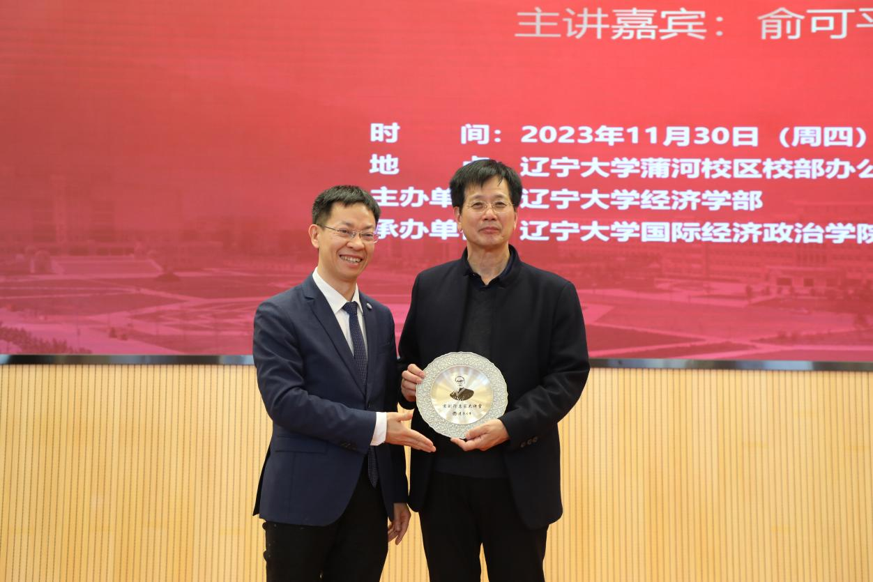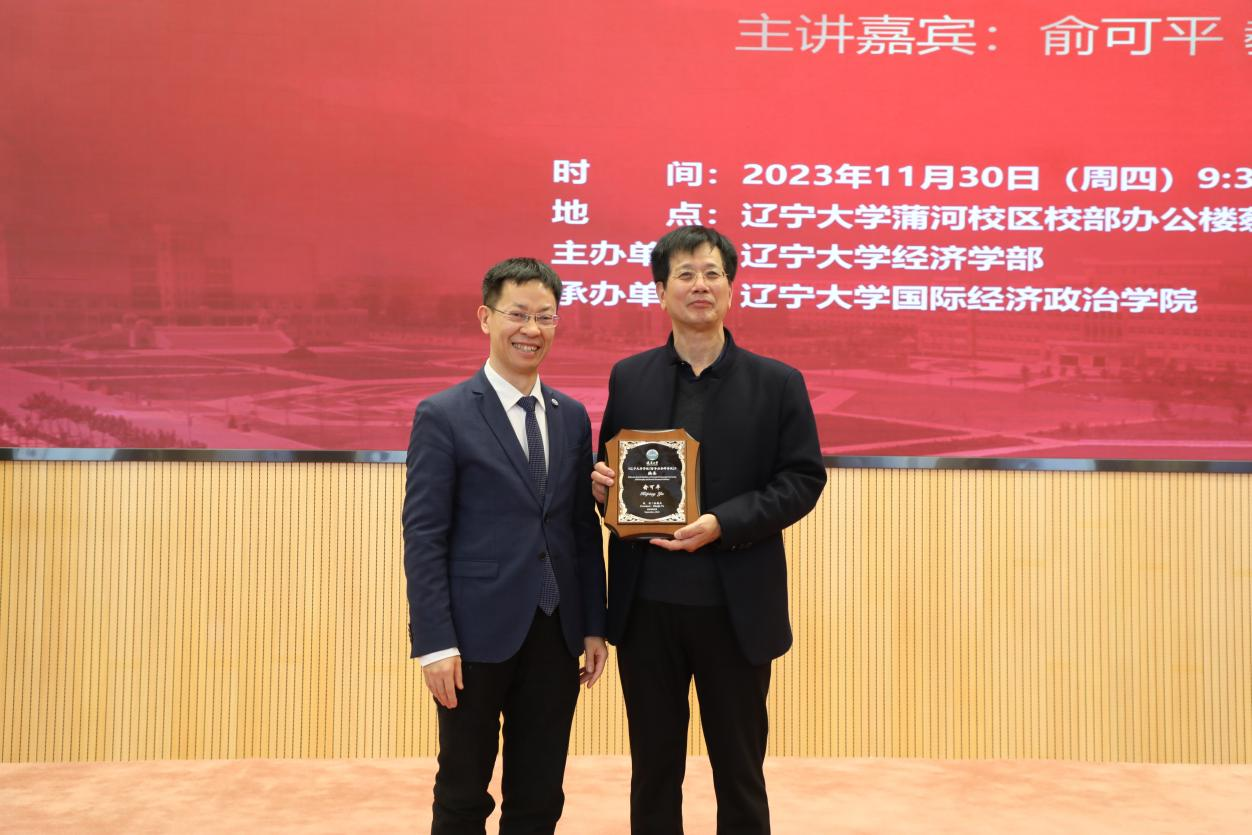 会议最后,余淼杰校长为俞可平教授颁发MK体育(国际)官方网站,mksport宋则行名家大讲堂纪念盘、MK体育(国际)官方网站,mksport终身名誉教授聘书以及《MK体育(国际)官方网站,mksport学报(哲学社会科学版)》编委证书,并互换学术著作。经济学部教师代表孔晓、尹如玉分别为俞教授佩戴校徽、赠送校帽并献花。与会嘉宾一同合影留念。