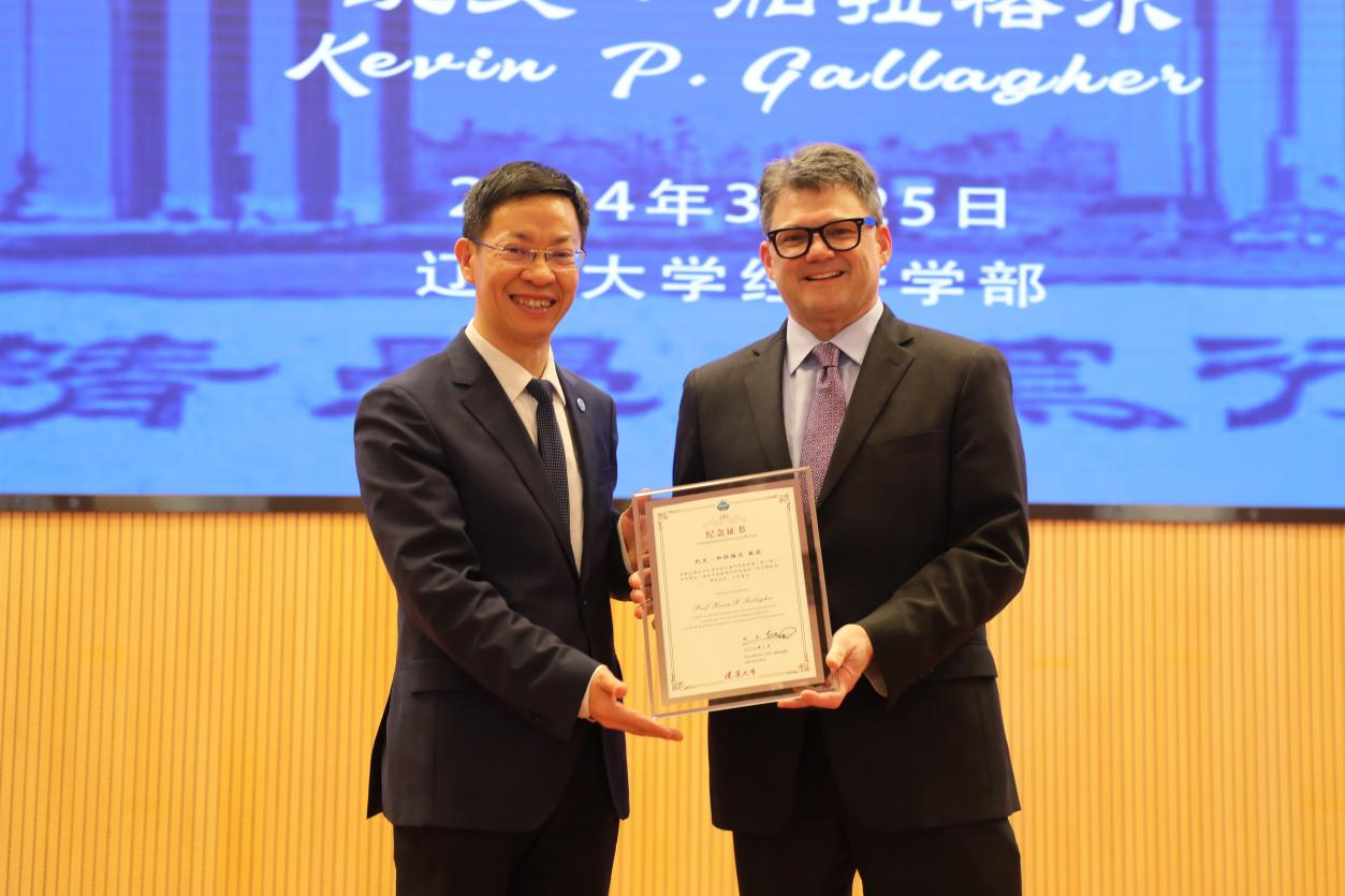 余淼杰校长对凯文・加拉格尔教授应邀出席白钦先海外名家讲座表示诚挚欢迎,详细介绍了凯文・加拉格尔教授的研究领域、学术成就,着重介绍了其对全球经济发展,特别是发展中国家可持续发展作出的重要贡献。