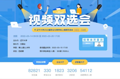 进一步做大做强校园招聘主渠道,与省内外各人社部门和产业园区加强合作。举办区域性、行业性、联合性的招聘活动4场。如承办辽宁省教育厅“2022届综合类高校毕业生网上专场招聘会”等。同时,积极参与并推广各省市人才推介活动,如黑龙江省嫩江市首届“百名‘经’英工程云上推介会”、山东省2022年“百校千企”人才对接活动、2022连云港市春季人才交流大会等。