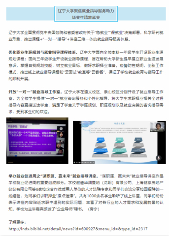 举办就业促进周之“谋职涯,赢未来”就业指导讲座。“谋职涯,赢未来”就业指导讲座作是学校就业促进周的重要组成部分。学校邀请华润置地(沈阳)有限公司、上海链家房地产经纪有限公司等8家校企合作优质用人单位的人才选聘专家和同学们交流分享校园招聘的一线经验,为同学们求职择业“指点迷津”。共有1000余名学生聆听了线上讲座,同学们纷纷表示讲座内容贴近求职中遇到的实际问题,丰富了对各行业的人才需求和发展前景的认知。学校为主讲嘉宾颁发了“企业导师”聘书。