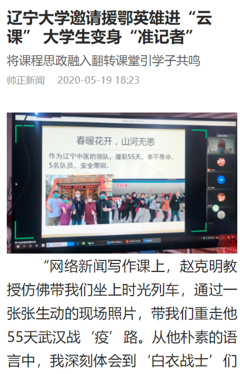 近日,《沈阳日报》纸媒与其官方客户端“帅正新闻”对我校“云课堂”邀请援鄂英雄为学生讲授思政课进行了报道,现将报道、截图等转载如下:
