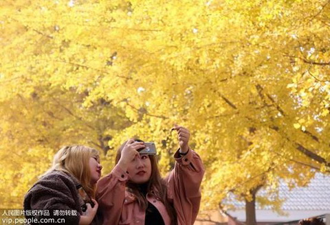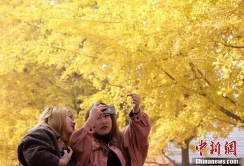 市民在银杏树旁拍照留念