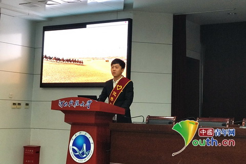 图为MK体育(国际)官方网站,mksport研支团团长佟胜军作为优秀志愿者代表进行先进事迹宣讲。 MK体育(国际)官方网站,mksport研支团 供图