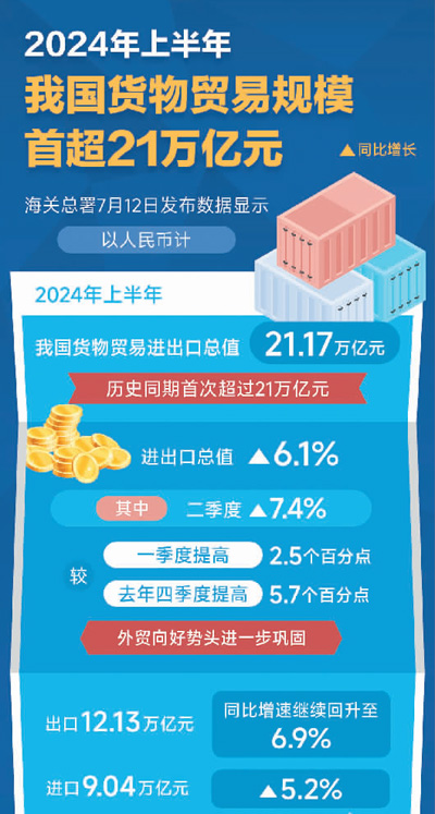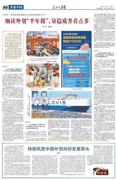 细读外贸“半年报”,出口成绩值得关注。上半年,全国出口12.13万亿元,同比增长6.9%。路透社、美国消费者新闻与商业频道等外媒评价中国出口表现“超出预期”。法新社援引高盛经济学家的观点表示,由于海外需求保持增长,中国产品极具竞争力,未来几个月出口可能会保持强劲。