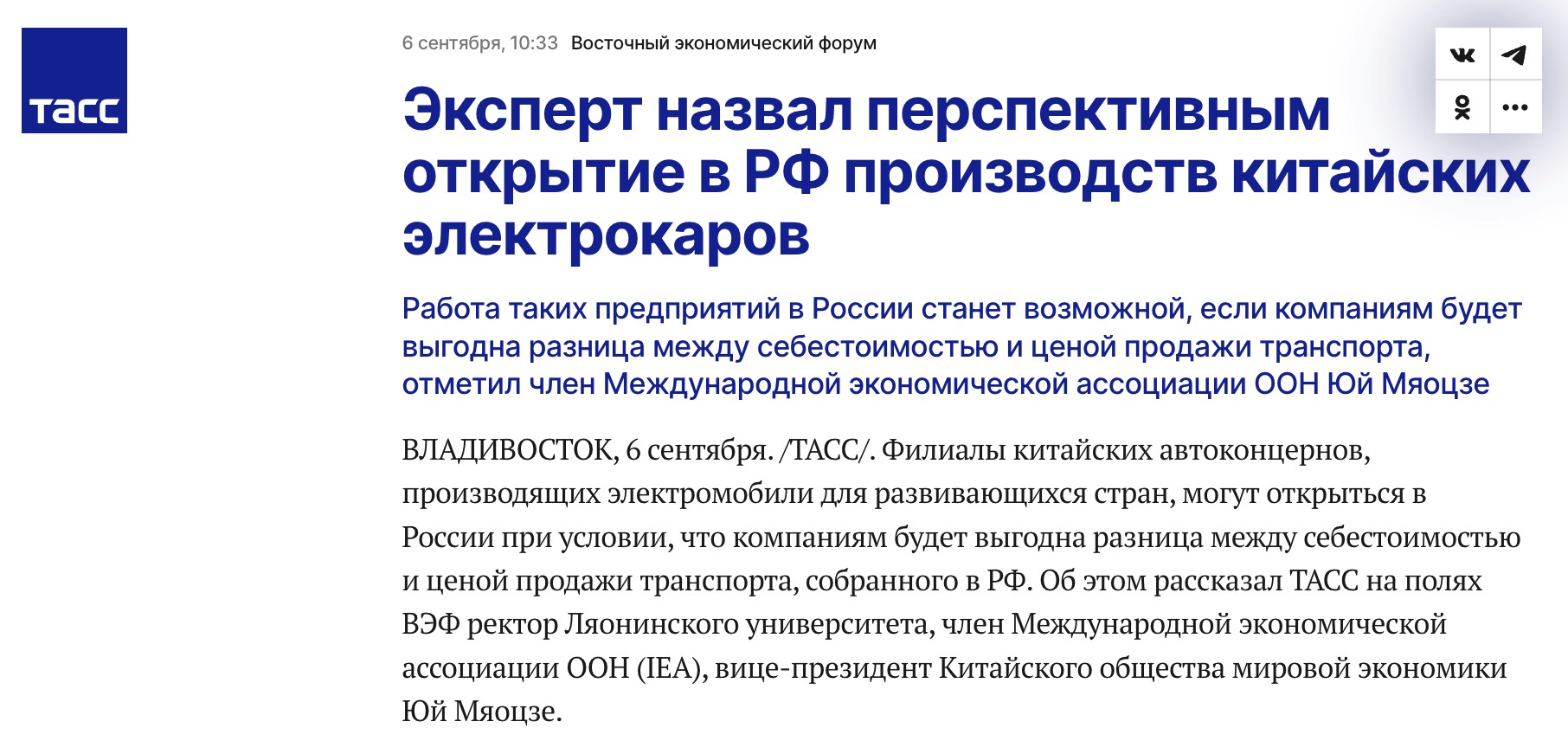 "Сейчас китайские электромобили продаются везде, особенно в развивающихся странах, они популярны. Китайские фирмы будут открывать филиалы в России, если фирмы решат, что им удастся обеспечить правильный уровень цен. Если Россия приветствует это, то данную перспективу можно рассматривать. Когда страна развивается до определенного этапа, она будет не только экспортировать, но и осуществлять прямые инвестиции за границу. Экспорт и инвестиции дополняют друг друга", - сказал ректор.