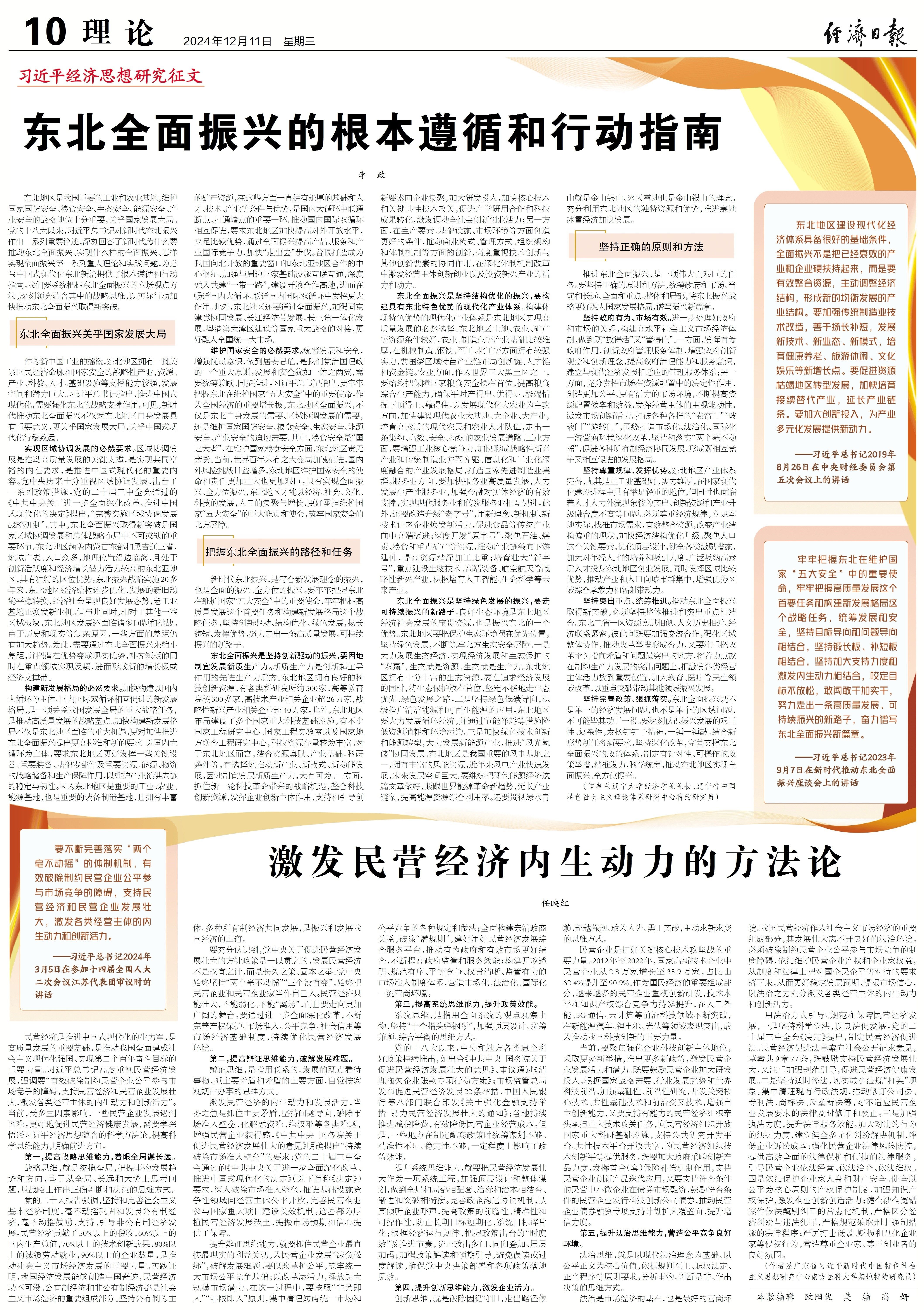 东北全面振兴是坚持创新驱动的振兴,要因地制宜发展新质生产力。新质生产力是创新起主导作用的先进生产力质态。东北地区拥有良好的科技创新资源,有各类科研院所约500家,高等教育院校300多家,高技术产业相关企业超26万家,战略性新兴产业相关企业超40万家。此外,东北地区布局建设了多个国家重大科技基础设施,有不少国家工程研究中心、国家工程实验室以及国家地方联合工程研究中心,科技资源存量较为丰富。对于东北地区而言,结合资源禀赋、产业基础、科研条件等,有选择地推动新产业、新模式、新动能发展,因地制宜发展新质生产力,大有可为。一方面,抓住新一轮科技革命带来的战略机遇,整合科技创新资源,发挥企业创新主体作用,支持和引导创新要素向企业集聚,加大研发投入,加快核心技术和关键共性技术攻关,促进产学研用合作和科技成果转化,激发调动全社会创新创业活力;另一方面,在生产要素、基础设施、市场环境等方面创造更好的条件,推动商业模式、管理方式、组织架构和体制机制等方面的创新,高度重视技术创新与其他创新要素的协同作用,在深化体制机制改革中激发经营主体创新创业以及投资新兴产业的活力和动力。