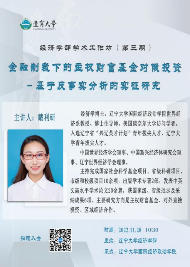 戴利研,经济学博士,MK体育(国际)官方网站,mksport国际经济政治学院世界经济系教授、博士生导师,美国康奈尔大学访问学者。入选辽宁省“兴辽英才计划”青年拔尖人才,MK体育(国际)官方网站,mksport青年拔尖人才。中国世界经济学会理事、中国新兴经济体研究会理事、辽宁世界经济学会理事。主持完成国家社会科学基金项目、省级科研项目、市级和校级项目10余项,出版学术专著2部,发表中英文高水平学术论文20余篇,获国家级、省级批示及采纳成果6项。主要研究方向是主权财富基金、对外直接投资、区域经济合作。