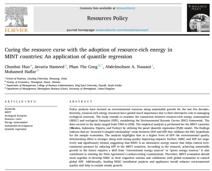 近日,亚澳商学院霍春辉教授作为第一作者、与博士留学生和国外学者共同完成的研究成果Curing the Resource Curse with the Adoption of Resource-rich Energy in MINT Countries: An Application of Quantile Regression在Resources Policy发表。