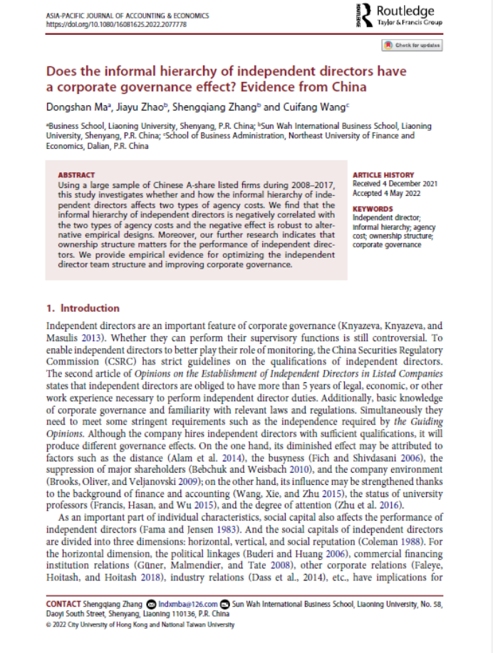 商学院教师马东山(第一作者)与新华国际商学院张胜强教授(通讯作者)合作的学术论文Does the informal hierarchy of independent directors have a corporate governance effect? Evidence from China在国际期刊Asia-Pacific Journal of Accounting & Economics在线发表。新华国际商学院硕士研究生赵佳瑜、东北财经大学工商管理学院博士研究生王萃芳参与论文写作。