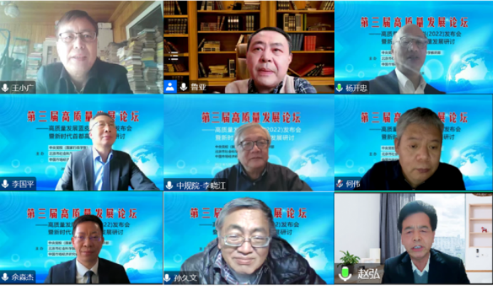 12月17日,由中央党校(国家行政学院)经济学教研部、北京市社会科学院与中国市场经济研究会共同主办,以“深入学习贯彻党的二十大精神,深化推动新时代首都高质量发展”为主题的第三届高质量发展论坛——高质量发展蓝皮书(2022)发布会暨新时代首都高质量发展研讨会在京举行。社会科学文献出版社副总编辑、皮书研究院院长蔡继辉,中央党校(国家行政学院)经济学教研部主任韩保江,中央党校(国家行政学院)科研部副主任孙晓莉出席会议并致辞。北京市社会科学院党组书记谢辉,中央党校(国家行政学院)经济学教研部主任韩保江,副主任许正中,北京市社会科学院副院长鲁亚分别主持论坛开幕致辞、高质量发展蓝皮书发布会、嘉宾演讲、首都高质量发展研讨四阶段会议。中央党校(国家行政学院)、国务院发展研究中心、中国社会科学院、中国科学院、人民日报、光明日报、经济日报、北京大学、中国人民大学、社会科学文献出版社、中国社会科学网、国家电网有限公司、中国民生银行、中国信息通信研究院、中国城市规划设计研究院、MK体育(国际)官方网站,mksport、北京市社会科学院、北京日报、北京电视台、前线杂志社等单位的领导和专家出席会议并研讨交流。中央党校(国家行政学院)经济学教研部、北京市社会科学院全体教研人员以线上方式参加会议。