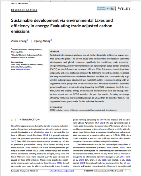 经济学院张紫薇副教授作为第一作者的合作论文Sustainable development via environmental taxes and efficiency in energy: Evaluating trade adjusted carbon emissions在Sustainable Development发表。