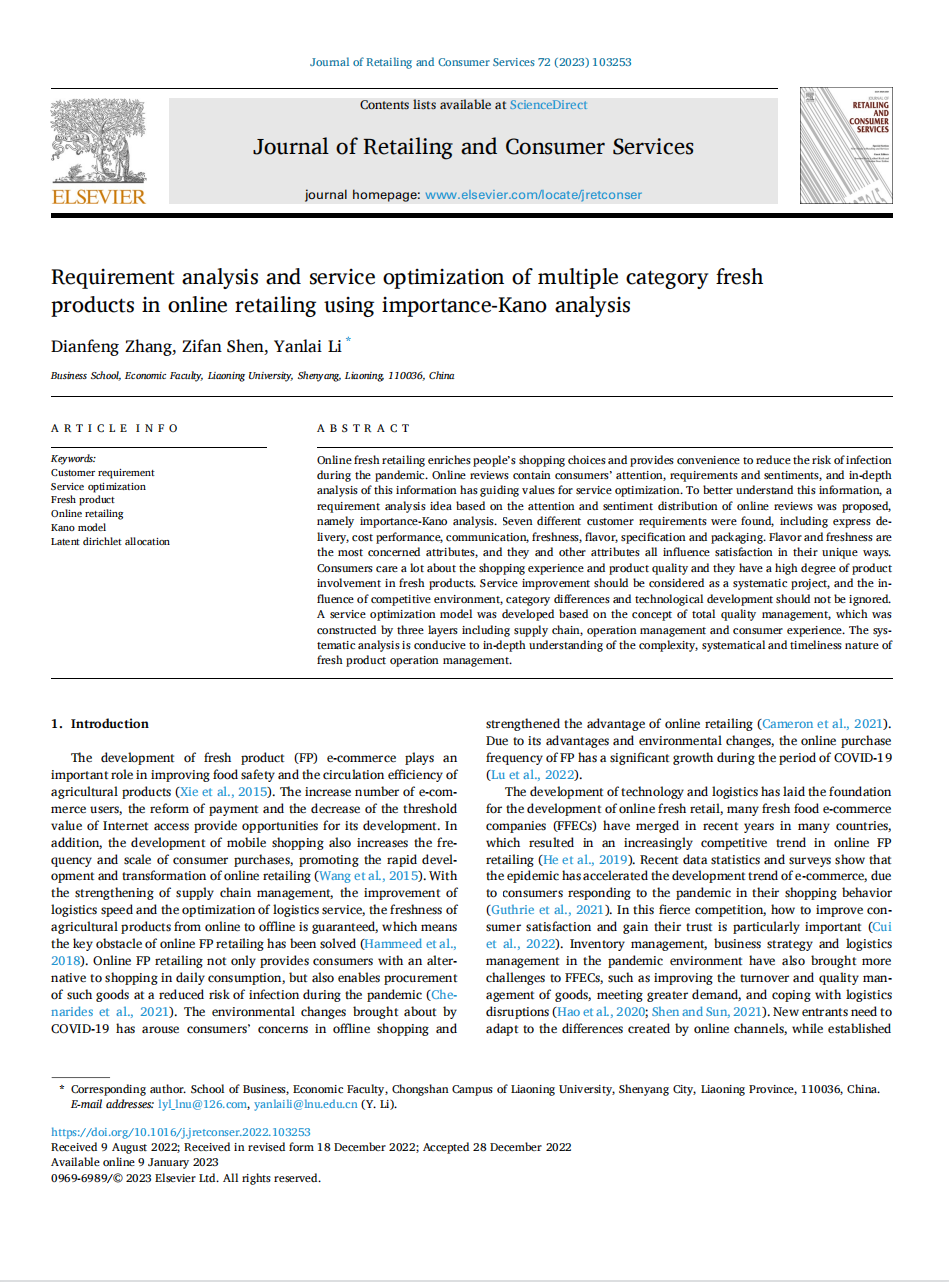 国际经济政治学院李延来教授(通讯作者)与其指导的博士生张殿峰和申子凡共同完成的学术论文Requirement analysis and service optimization of multiple category fresh products in online retailing using importance-Kano analysis?在Journal of Retailing and Consumer Services发表。