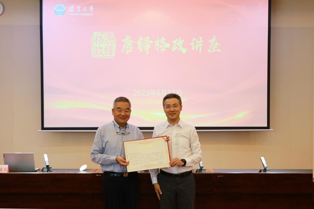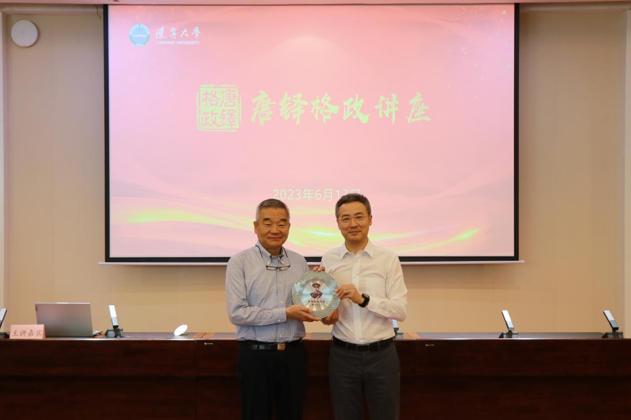 在讲座第二环节中,校党委常委、副校长霍春辉教授为刘曙光研究员颁发“唐铎格政讲座”纪念证书、纪念盘,历史学部考古文博学院教师代表为刘曙光研究员献花致敬。