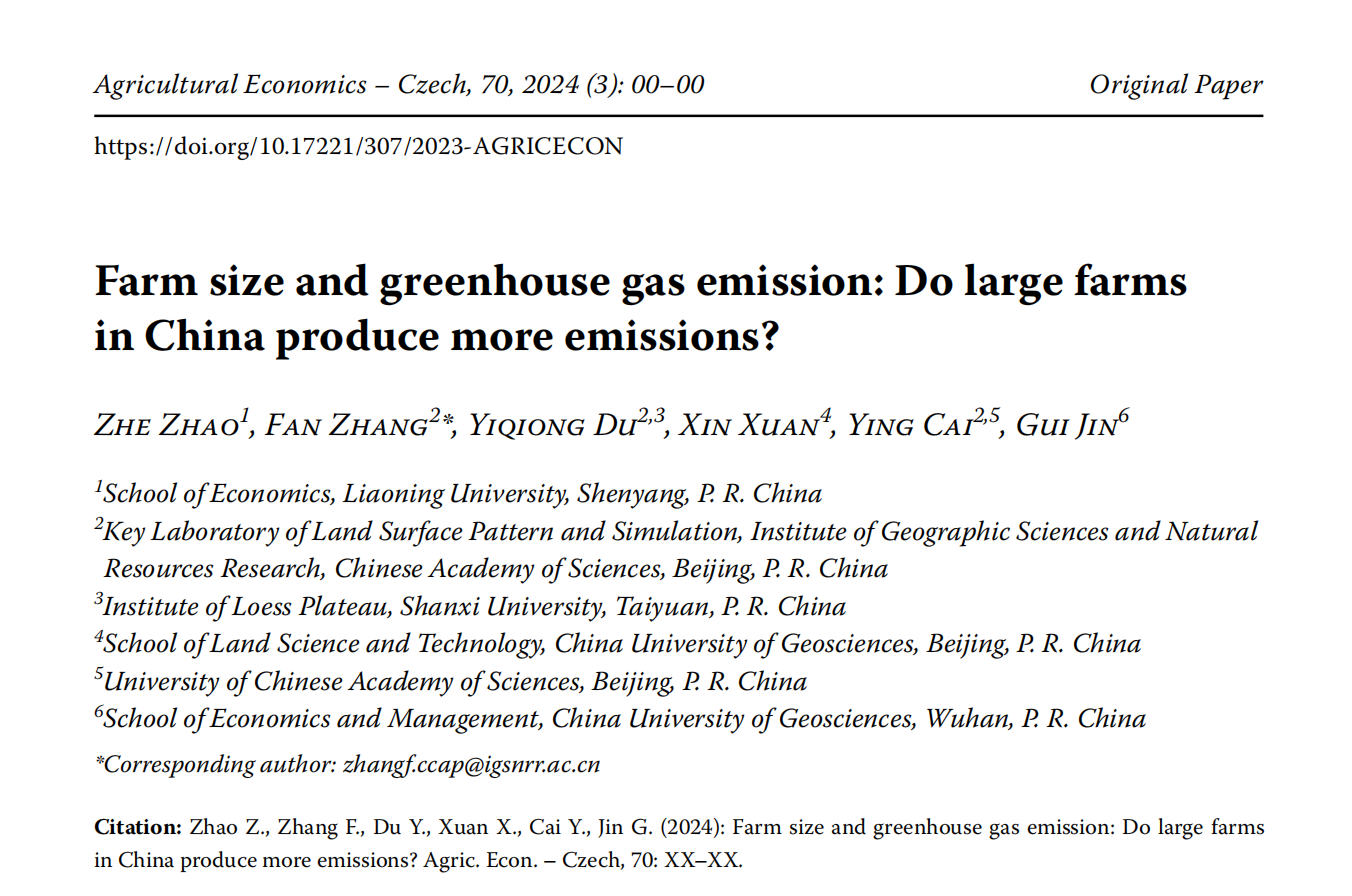 经济学院赵哲副教授(第一作者)与中国科学院地理科学与资源研究所张帆副研究员(通讯作者)合作的论文“Farm size and Greenhouse gas emission: Do large Farms in China produce more emissions?”在农业经济领域权威期刊Agricultural Economics发表。
