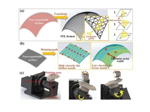图 2 描述了共形表面切片原理、不同类型喷嘴在共形表面上的路径规划以及五轴联动系统的共形表面打印原理。