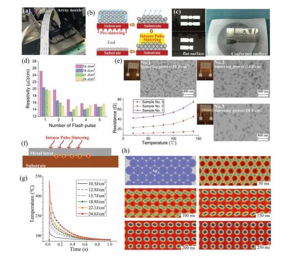 图 3 展示了使用阵列喷嘴通过纳米银墨水打印并经过脉冲紫外光烧结制成的电池电流收集器、导电路径和电阻温度传感器,还展示了不同烧结功率下纳米银的电阻率变化,以及温度传感器的微观结构和温度依赖性。