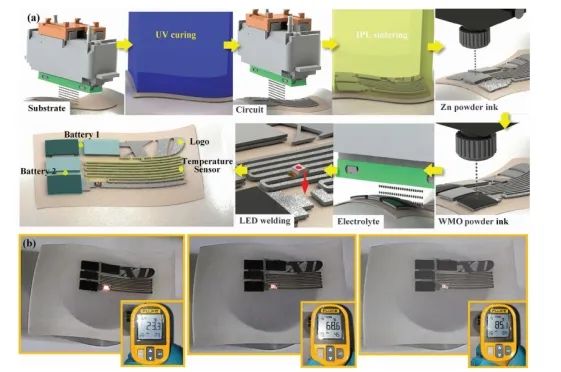 图 1 展示了共形温度测量电路的制造过程和温度变化测试,说明了通过五轴联动系统打印电路基底、导电路径、电池集流体和电阻温度传感器,并通过脉冲紫外光固化形成电路。电路对温度变化的响应通过LED亮度的变化来表示。