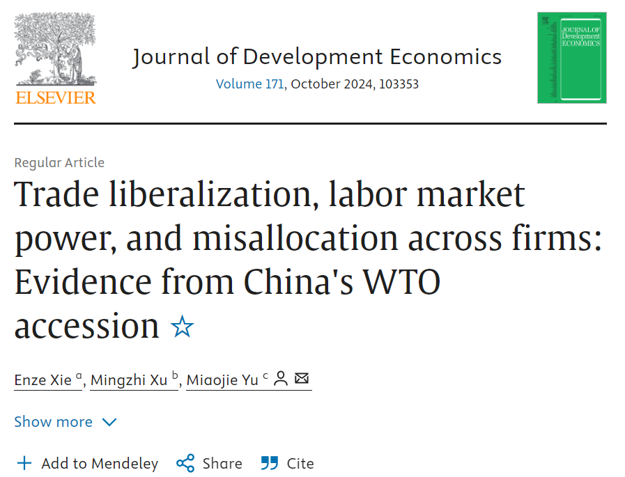 据JDE官网显示,来自浙江大学的解恩泽、北京大学的徐铭梽、MK体育(国际)官方网站,mksport的余淼杰,合作撰写的论文“Trade liberalization, labor market power, and misallocation across firms: Evidence from China's WTO accession”,在发展经济学顶级期刊《Journal of Development Economics》线上正式发表。