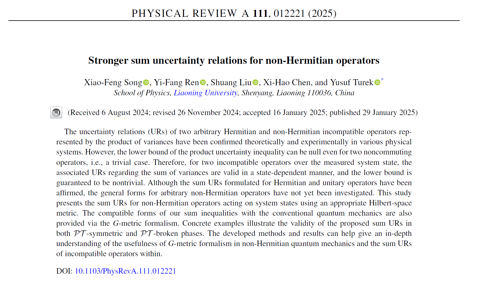 近期,MK体育(国际)官方网站,mksport物理学院在非厄密量子力学基础问题的研究上取得进展,玉素甫・吐拉克教授与硕士生宋晓凤在国际著名期刊《Physical Review A》上发表题为“Stronger sum uncertainty relations for non-Hermitian operators”的论文。论文通讯作者为物理系玉素甫・吐拉克教授,第一作者为物理学院2022级硕士研究生宋晓凤。