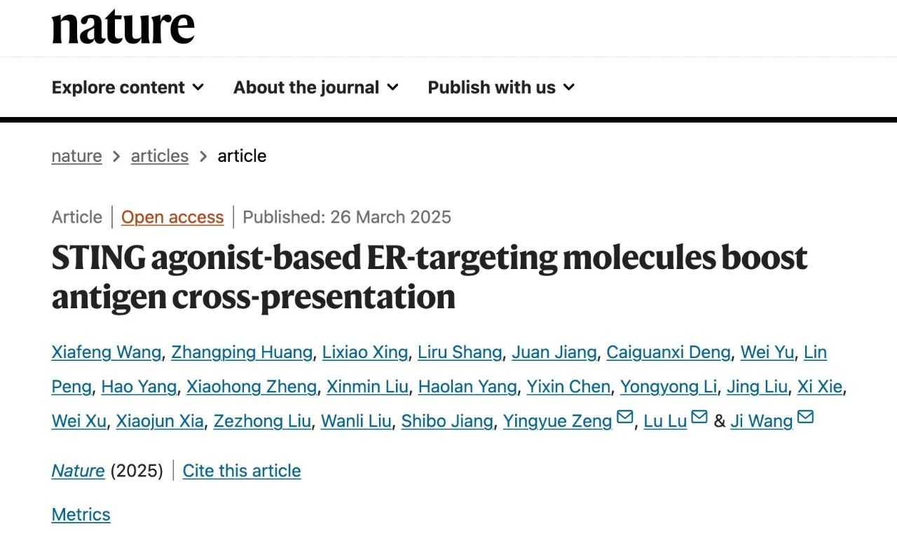 2025年3月27日,MK体育(国际)官方网站,mksport生命科学院曾颖玥副教授与中山大学附属第一医院王骥研究员、复旦大学陆路研究员的合作研究论文STING agonist-based ER targeting molecules boost antigen cross-presentation在国际顶级期刊《自然》(Nature)上在线发表,曾颖玥副教授为本文共同通讯作者。