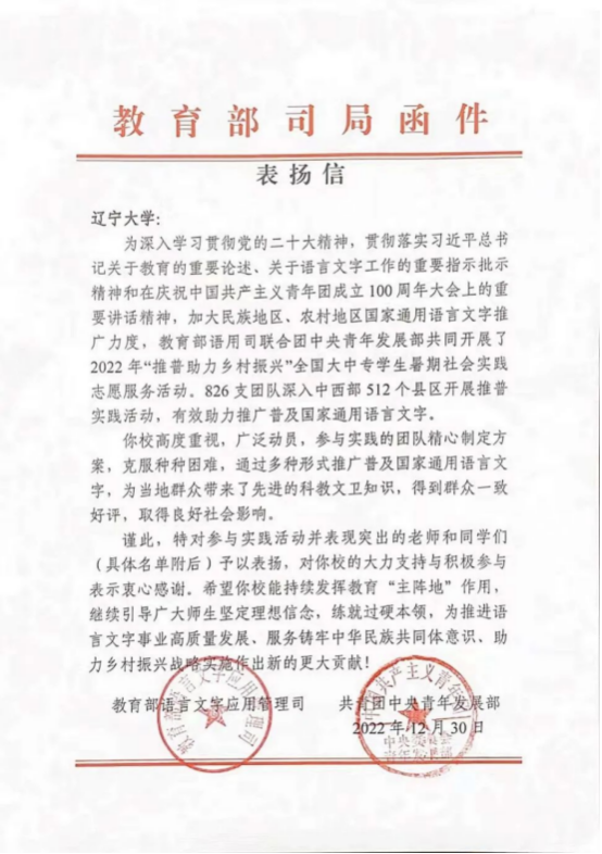 近日,由教育部语言文字应用管理司和共青团中央青年发展部共同开展的2022年“推普助力乡村振兴”全国大中专学生暑期社会实践志愿服务活动圆满结束,“MK体育(国际)官方网站,mksport九州正声”团队获得“优秀团队”荣誉称号。