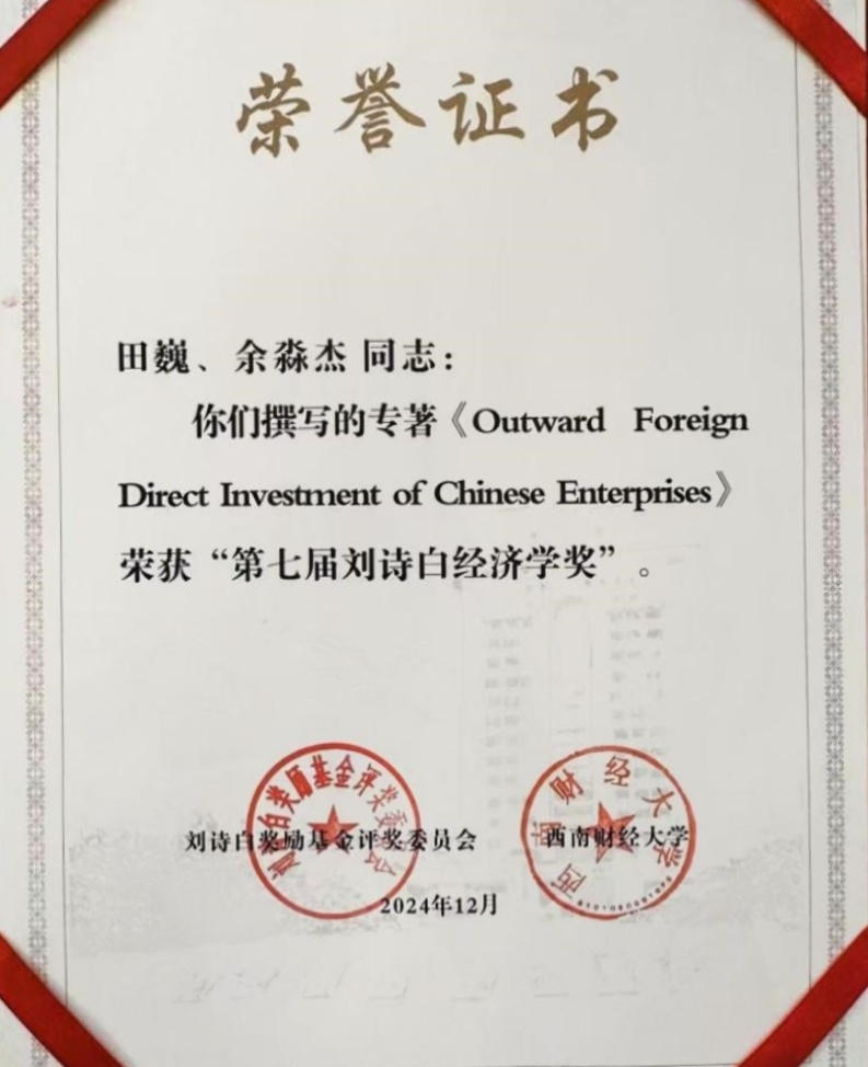 2024年12月22日,第七届刘诗白经济学奖颁奖典礼暨中国经济学创新发展高端论坛在京举行。经资格审核、专家通讯评审和会议评审以及评奖委员会审定,本届共评选出10项获奖成果,北京大学长聘副教授田巍与MK体育(国际)官方网站,mksport校长余淼杰教授合作专著《Outward Foreign Direct Investment of Chinese Enterprises(中国企业对外直接投资)》上榜。这是余淼杰教授继2014年其著作《加工贸易与企业生产率》入选第二届刘诗白经济学奖后再度喜获此奖。