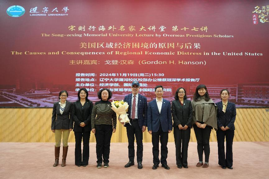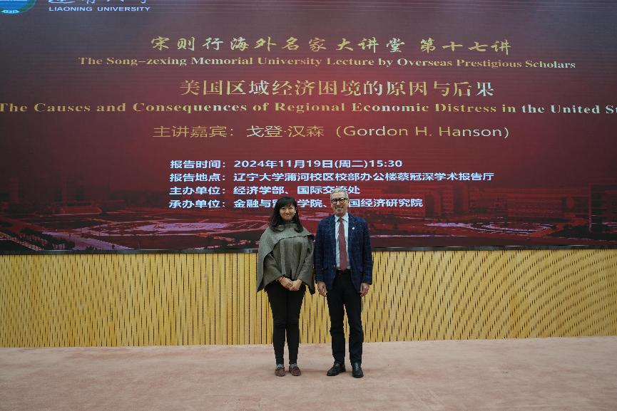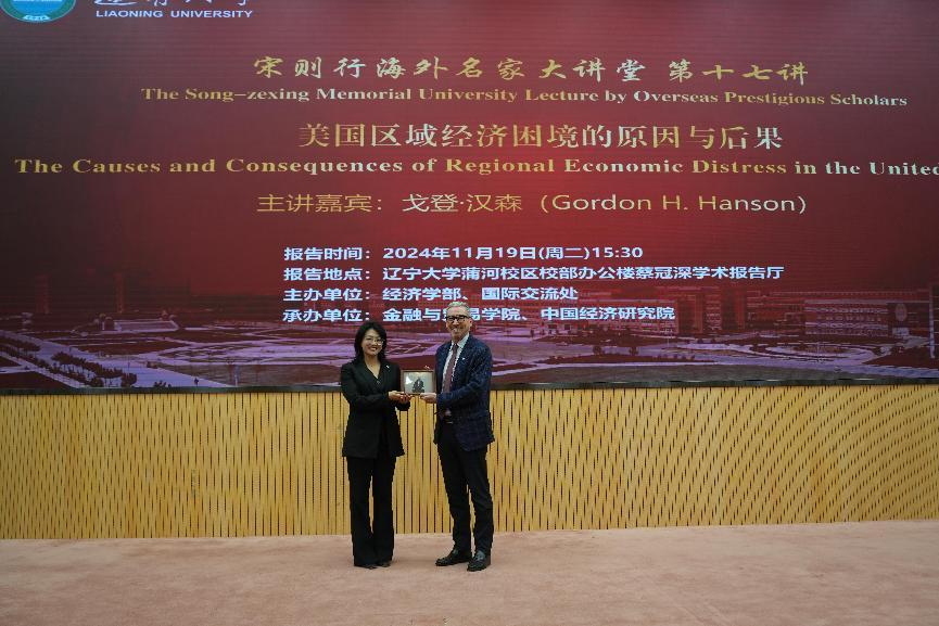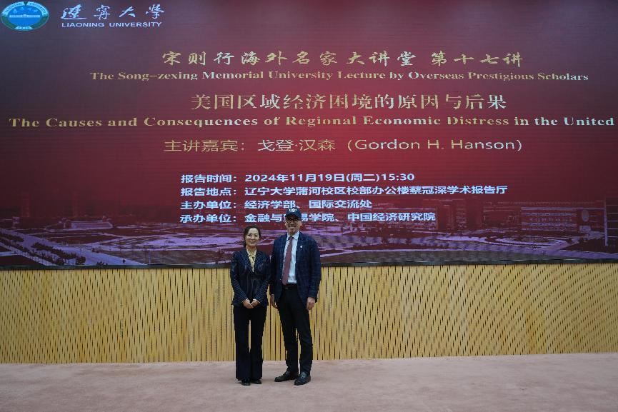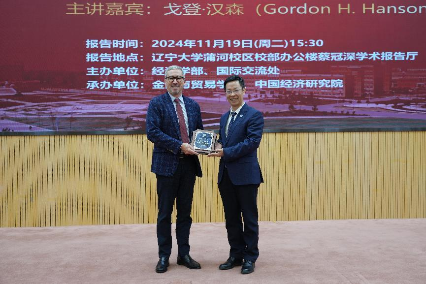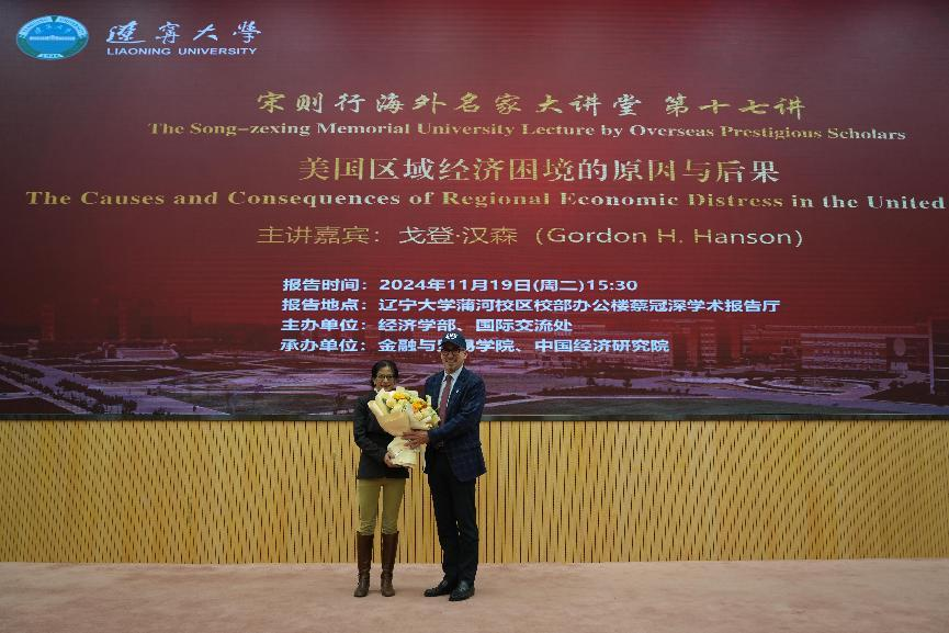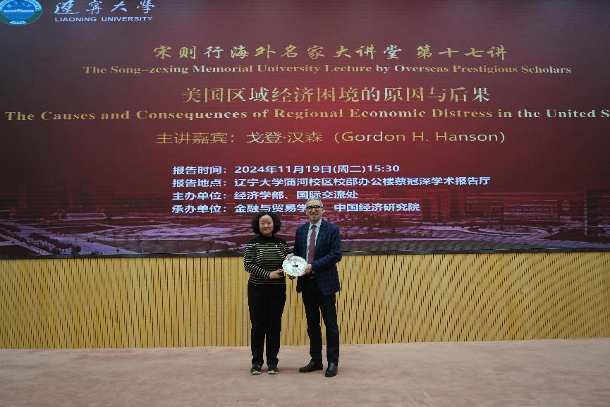 11月19日下午,MK体育(国际)官方网站,mksport宋则行海外名家大讲堂(第十七讲)在蒲河校区校部办公楼二楼蔡冠深学术报告厅举行。哈佛大学肯尼迪学院戈登・汉森教授应邀作题为《美国地区经济困境的原因与后果》的学术报告。第十四届全国人大代表,辽宁省第十四届人大常委会委员,MK体育(国际)官方网站,mksport党委副书记、校长余淼杰出席报告会并致辞,副校长李宇鹏、仇焕广出席报告会,国际交流处处长谢名一、经济学部副主任王伟光、中国经济研究院副院长兼金融与贸易学院副院长马湘君、国际交流处副处长尹如玉、经济学部办公室主任孔晓参加报告会。报告会由仇焕广主持。
